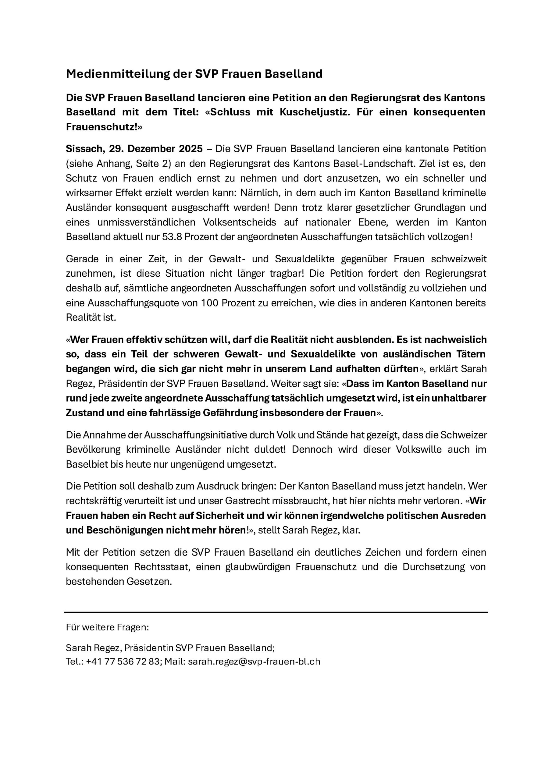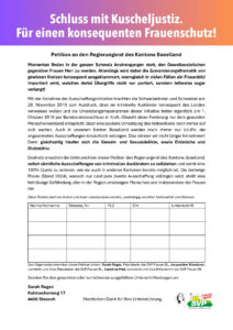 Medienmitteilung der SVP Frauen Baselland Die SVP Frauen Baselland lancieren eine Petition an den Regierungsrat des Kantons Baselland mit dem Titel: «Schluss mit Kuscheljustiz. Für